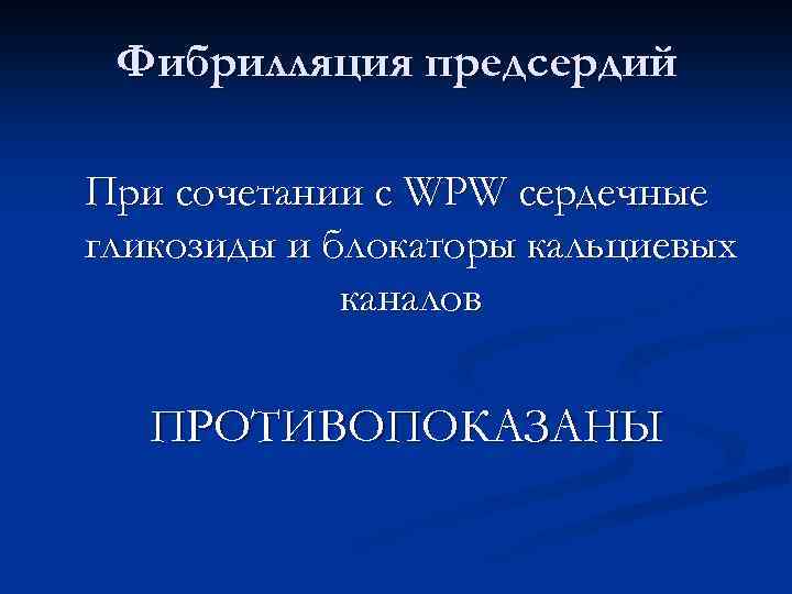 Фибрилляция предсердий При сочетании с WPW сердечные гликозиды и блокаторы кальциевых каналов ПРОТИВОПОКАЗАНЫ