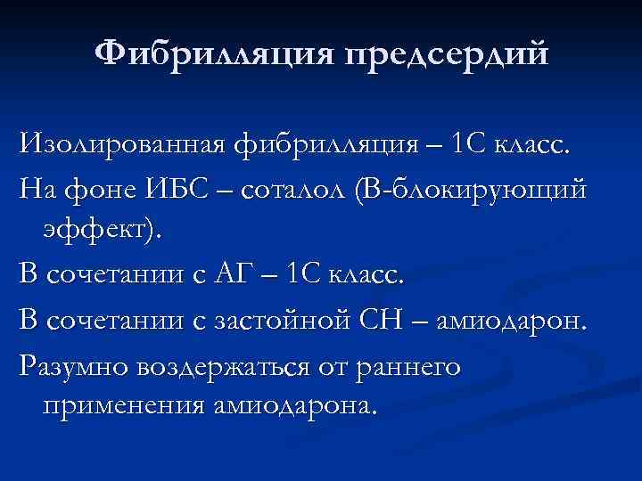 Фибрилляция предсердий Изолированная фибрилляция – 1 С класс. На фоне ИБС – соталол (В-блокирующий эффект). В сочетании с АГ – 1 С класс. В сочетании с застойной СН – амиодарон. Разумно воздержаться от раннего применения амиодарона.