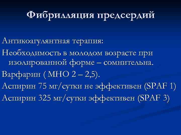 Фибрилляция предсердий Антикоагулянтная терапия: Необходимость в молодом возрасте при изолированной форме – сомнительна. Варфарин ( МНО 2 – 2, 5). Аспирин 75 мг/сутки не эффективен (SPAF 1) Аспирин 325 мг/сутки эффективен (SPAF 3)