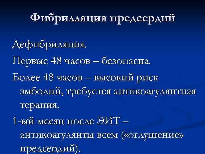 Фибрилляция предсердий Дефибриляция. Первые 48 часов – безопасна. Более 48 часов – высокий риск эмболий, требуется антикоагулянтная терапия. 1 -ый месяц после ЭИТ – антикоагулянты всем ( «оглушение» предсердий).