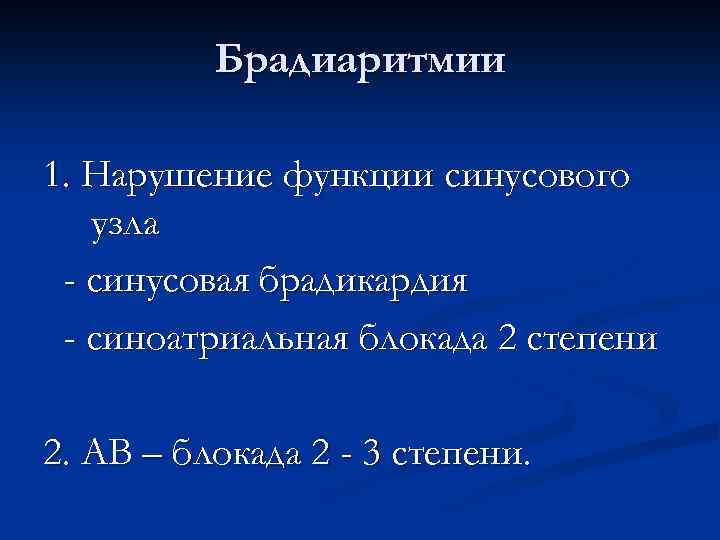 Брадиаритмии 1. Нарушение функции синусового узла - синусовая брадикардия - синоатриальная блокада 2 степени 2. АВ – блокада 2 - 3 степени.