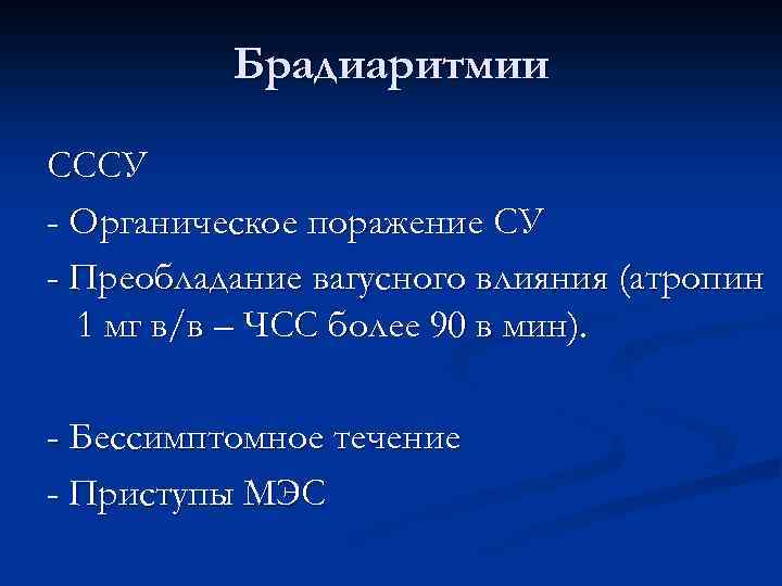 Брадиаритмии СССУ - Органическое поражение СУ - Преобладание вагусного влияния (атропин 1 мг в/в – ЧСС более 90 в мин). - Бессимптомное течение - Приступы МЭС