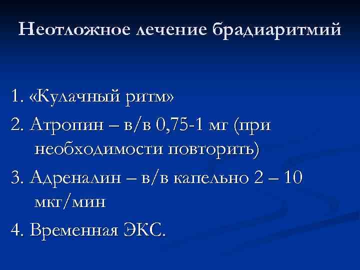 Неотложное лечение брадиаритмий 1. «Кулачный ритм» 2. Атропин – в/в 0, 75 -1 мг (при необходимости повторить) 3. Адреналин – в/в капельно 2 – 10 мкг/мин 4. Временная ЭКС.