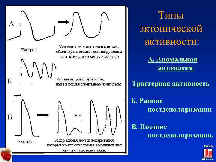 МЕХАНИЗМЫ РАЗВИТИЯ АРИТМИЙ НАРУШЕНИЕ ОБРАЗОВАНИЯ ИМПУЛЬСА • нарушение нормального автоматизма • латентный автоматизм • анормальный автоматизм • триггерная активность: ранние и задержанные постдеполяризации НАРУШЕНИЕ ПРОВЕДЕНИЯ ИМПУЛЬСА • замедление или прекращение проведения • ускорение проведения (сверхнормальное проведение) • повторный вход возбуждения (re-entry) КОМБИНИРОВАННЫЕ НАРУШЕНИЯ ОБРАЗОВАНИЯ И ПРОВЕДЕНИЯ ИМПУЛЬСА