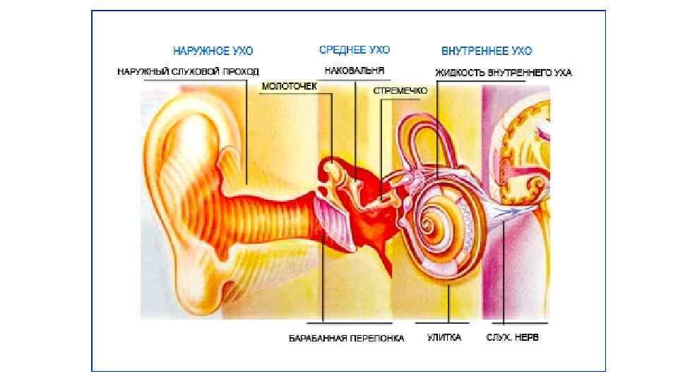 Орган слуха • наружное ухо, куда входят ушная раковина и наружный слуховой проход; • среднее ухо включает барабанную перепонку, полость среднего уха с системой слуховых косточек (молоточек, наковальня, стремечко) и слуховую трубу, соединяющую полость среднего уха с носоглоткой; • внутреннее ухо, которое состоит из улитки, отвечающей за преобразование механических звуковых волн в нервные импульсы, и системы лабиринтов, контролирующих равновесие человека. Система лабиринтов представлена костными трубочками в виде полуколец, взаимно перпендикулярных другу. Благодаря им, мы четко ощущаем наше положение в пространстве.
