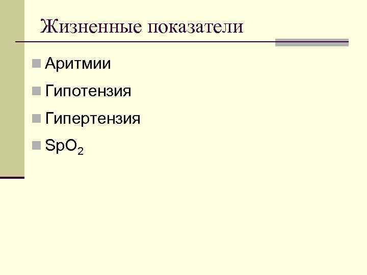 Жизненные показатели n Аритмии n Гипотензия n Гипертензия n Sp. O 2