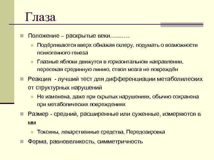 Глаза n Положение – раскрытые веки………. n Подёргиваются вверх обнажая склеру, подумать о возможности психогенного генеза n Глазные яблоки движутся в горизонтальном направлении, пересекая срединную линию, ствол мозга не повреждён n Реакция - лучший тест для дифференциации метаболилеских от структурных нарушений n Не изменена, даже при скрытых нарушениях, обычно сохранена при метаболических повреждениях n Размер - средний, расширенные или суженные, измеряются в мм n Токсины, лекарственные средства, Передозировка n Форма, равновеликость, симметричность