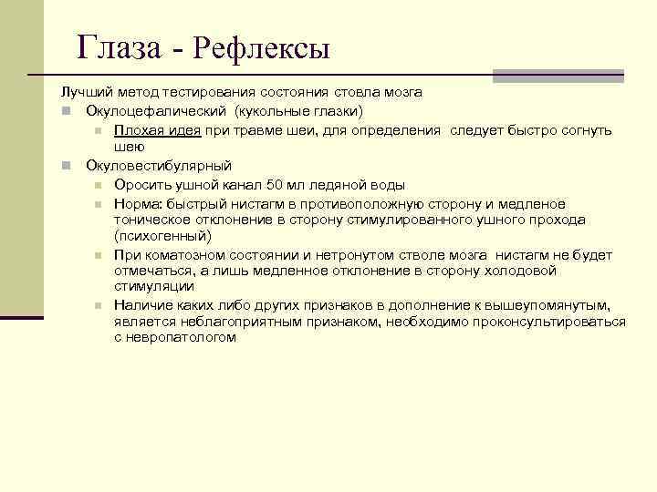 Глаза - Рефлексы Лучший метод тестирования состояния стовла мозга n Окулоцефалический (кукольные глазки) n Плохая идея при травме шеи, для определения следует быстро согнуть шею n Окуловестибулярный n Оросить ушной канал 50 мл ледяной воды n Норма: быстрый нистагм в противоположную сторону и медленое тоническое отклонение в сторону стимулированного ушного прохода (психогенный) n При коматозном состоянии и нетронутом стволе мозга нистагм не будет отмечаться, а лишь медленное отклонение в сторону холодовой стимуляции n Наличие каких либо других признаков в дополнение к вышеупомянутым, является неблагоприятным признаком, необходимо проконсультироваться с невропатологом