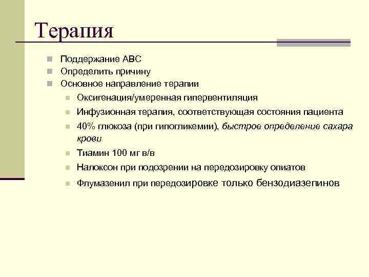 Терапия n Поддержание ABC n Определить причину n Основное направление терапии n Оксигенация/умеренная гипервентиляция n Инфузионная терапия, соответствующая состояния пациента n 40% глюкоза (при гипогликемии), быстрое определение сахара крови n Тиамин 100 мг в/в n Налоксон при подозрении на передозировку опиатов n Флумазенил при передозировке только бензодиазепинов