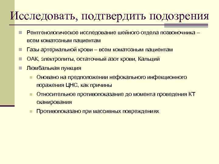 Исследовать, подтвердить подозрения n Рентгенологическое исследование шейного отдела позвоночника – всем коматозным пациентам n Газы артериальной крови – всем коматозным пациентам n ОАК, электролиты, остаточный азот крови, Кальций n Люмбальная пункция n Оновано на предположении нефокального инфекционного поражения ЦНС, как причины n Относительное противопоказание до момента проведения КТ сканирования n Противопоказано при массивных повреждениях