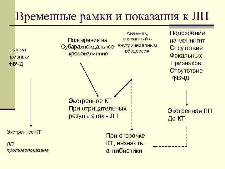 Временные рамки и показания к ЛП Травма признаки ВЧД Анамнез, связанный с Подозрение на Субарахноидальное внутричерепным абсцессом кровоизлияние Экстренное КТ При отрицательных результатах - ЛП Экстренное КТ ЛП противопоказана При отсрочке КТ, назначть антибиотики Подозрение на менингит Отсутствие Фокальных признаков Отсутствие ВЧД Экстренная ЛП До КТ