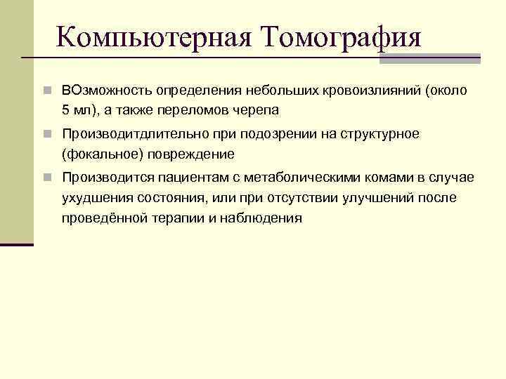 Компьютерная Томография n ВОзможность определения небольших кровоизлияний (около 5 мл), а также переломов черепа n Производитдлительно при подозрении на структурное (фокальное) повреждение n Производится пациентам с метаболическими комами в случае ухудшения состояния, или при отсутствии улучшений после проведённой терапии и наблюдения