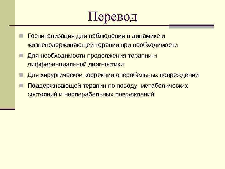 Перевод n Госпитализация для наблюдения в динамике и жизнеподерживающей терапии при необходимости n Для необходимости продолжения терапии и дифференциальной диагностики n Для хирургической коррекции операбельных повреждений n Поддерживающей терапии по поводу метаболических состояний и неоперабельных повреждений
