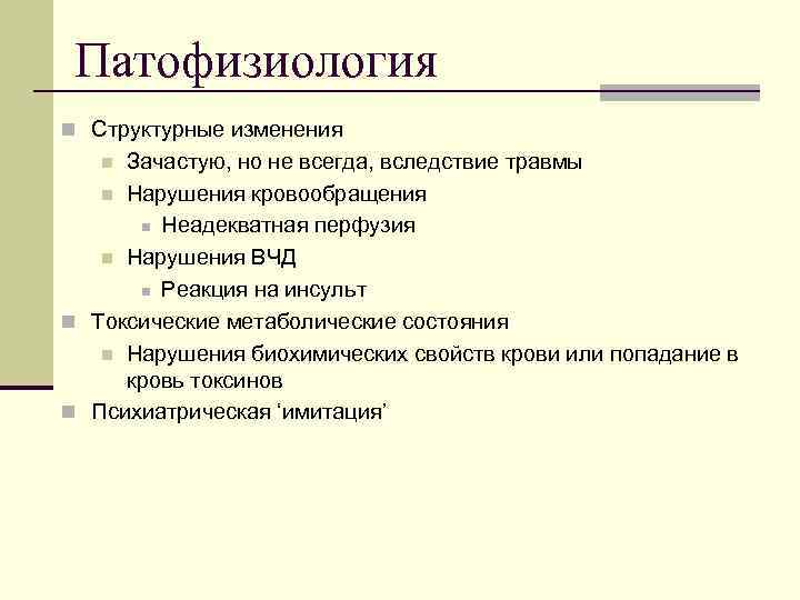 Патофизиология n Структурные изменения Зачастую, но не всегда, вследствие травмы n Нарушения кровообращения n Неадекватная перфузия n Нарушения ВЧД n Реакция на инсульт n Токсические метаболические состояния n Нарушения биохимических свойств крови или попадание в кровь токсинов n Психиатрическая ‘имитация’ n