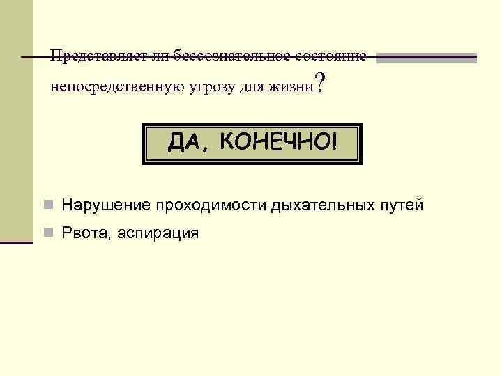 Представляет ли бессознательное состояние непосредственную угрозу для жизни ? ДА, КОНЕЧНО! n Нарушение проходимости дыхательных путей n Рвота, аспирация