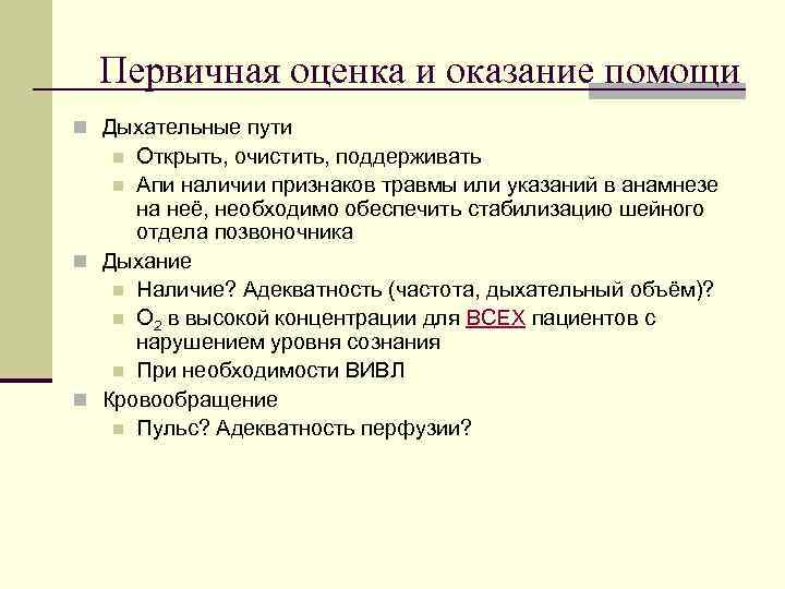 Первичная оценка и оказание помощи n Дыхательные пути Открыть, очистить, поддерживать n Апи наличии признаков травмы или указаний в анамнезе на неё, необходимо обеспечить стабилизацию шейного отдела позвоночника n Дыхание n Наличие? Адекватность (частота, дыхательный объём)? n O 2 в высокой концентрации для ВСЕХ пациентов с нарушением уровня сознания n При необходимости ВИВЛ n Кровообращение n Пульс? Адекватность перфузии? n