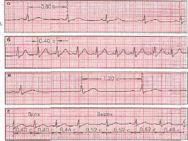 1. Задержка дыхания ведет к исчезновению дыхательной формы СА, тогда как недыхательная форма СА сохраняется. 2. Синусовая дыхательная аритмия, обусловленная функциональной ваготонией, усиливается приеме β-адреноблокаторов и прекращается под влиянием атропина. При органическом повреждении СА-узла, сопровождающемся недыхательной формой СА, эти фармакологические тесты оказываются отрицательными.