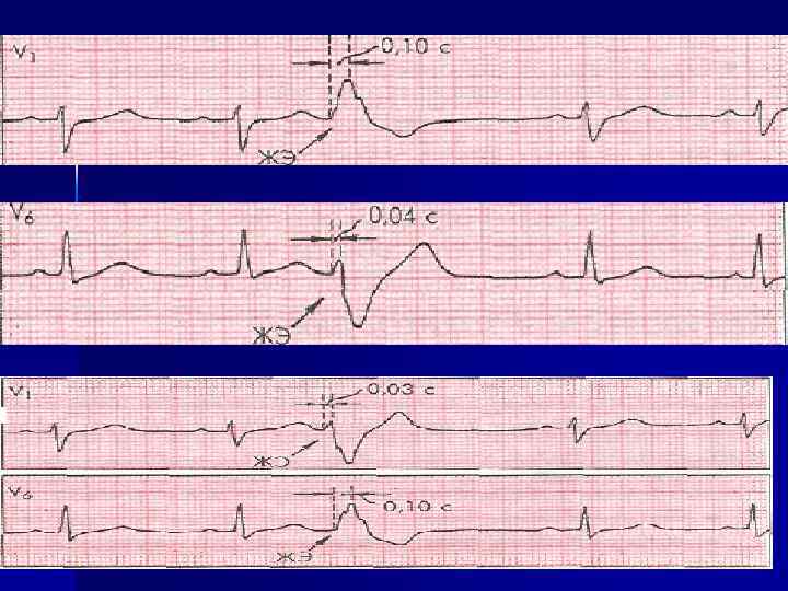 ЭКГ-признаки желудочковой экстрасистолии (ЖЭ) 1 Преждевременное появление на ЭКГ измененного желудочкового комплекса QRS. 2 Значительное расширение (до 0, 12 с и больше) и QRS ′ 3. Расположение сегмента RS-T′ и зубца Т экстрасистолы дискордантно направлению основного зубца комплекса QRS'. 4. Отсутствие перед ЖЭ зубца Р. 5. Наличие после ЖЭ полной компенсаторной паузы.