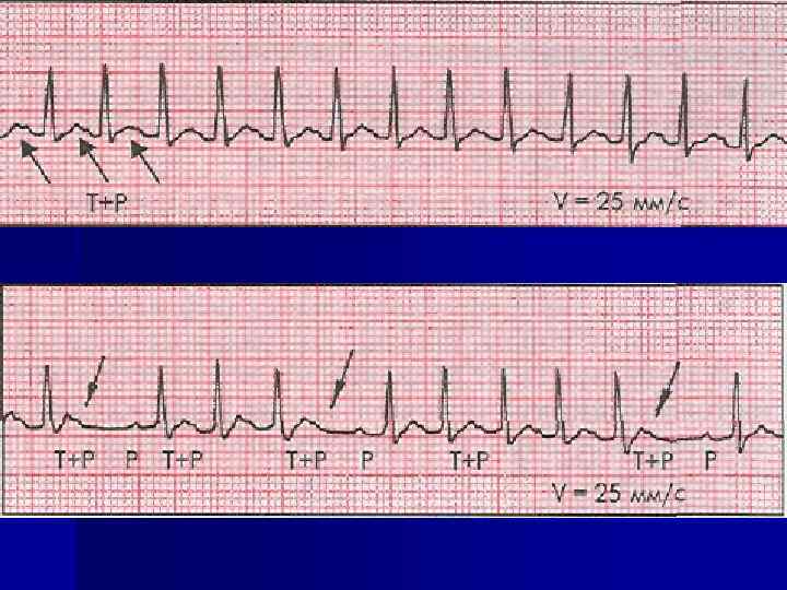 ЭКГ-признаки предсердных ПТ 1. Внезапно начинающийся и так же внезапно заканчивающийся приступ учащения сердечных сокращений до 140 -250 ударов в минуту при сохранении правильного ритма. 2. Наличие перед каждым желудочковым комплексом QRS' сниженного, деформированного, двухфазного или отрицательного зубца Р'. 3. Нормальные неизмененные желудочковые комплексы QRS', похожие на QRS, регистрировавшиеся до возникновения приступа
