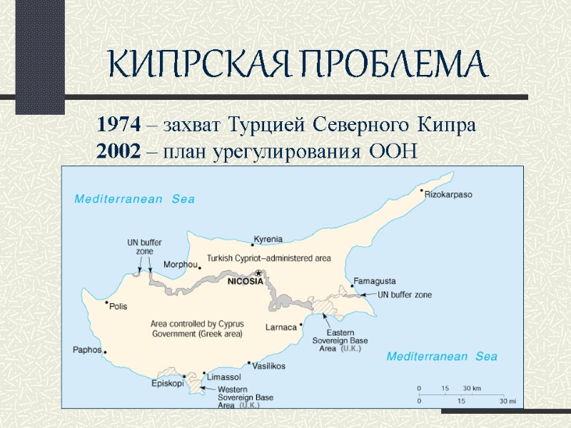 КИПРСКАЯ ПРОБЛЕМА 1974 – захват Турцией Северного Кипра 2002 – план урегулирования ООН