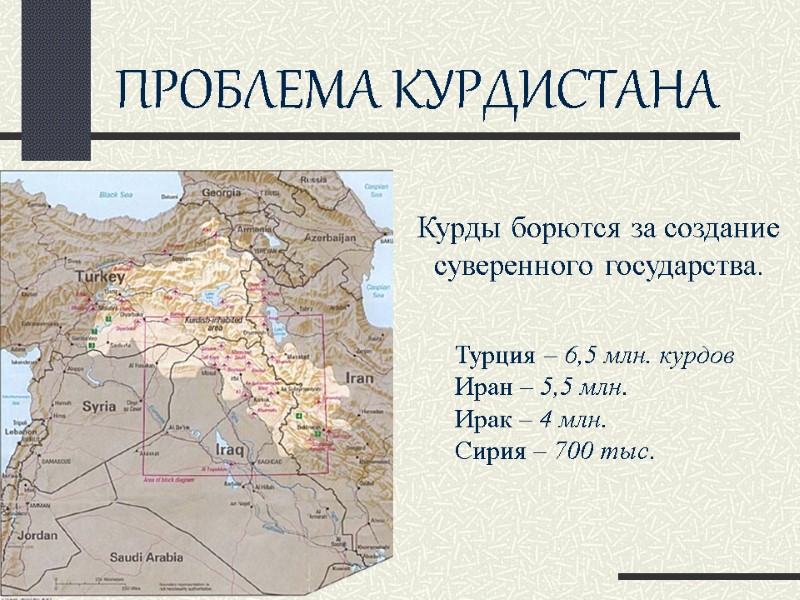 ПРОБЛЕМА КУРДИСТАНА Турция – 6,5 млн. курдов Иран – 5,5 млн. Ирак – 4 млн. Сирия – 700 тыс. Курды борются за создание суверенного государства.