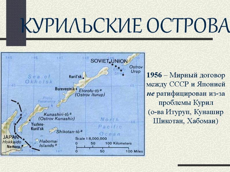КУРИЛЬСКИЕ ОСТРОВА 1956 – Мирный договор между СССР и Японией не ратифицирован из-за проблемы Курил (о-ва Итуруп, Кунашир Шикотан, Хабомаи)