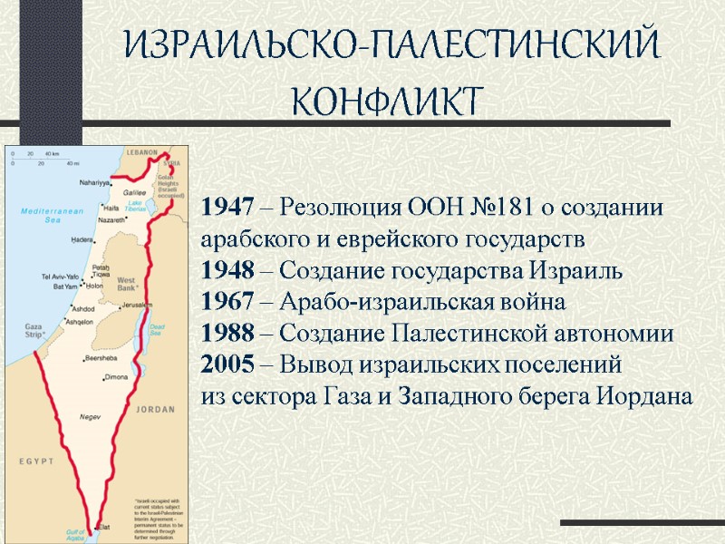 ИЗРАИЛЬСКО-ПАЛЕСТИНСКИЙ КОНФЛИКТ 1947 – Резолюция ООН №181 о создании арабского и еврейского государств 1948 – Создание государства Израиль 1967 – Арабо-израильская война 1988 – Создание Палестинской автономии 2005 – Вывод израильских поселений из сектора Газа и Западного берега Иордана