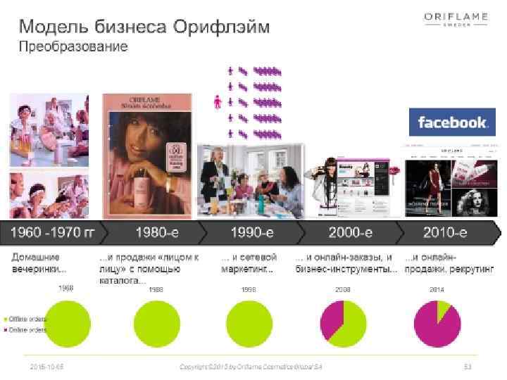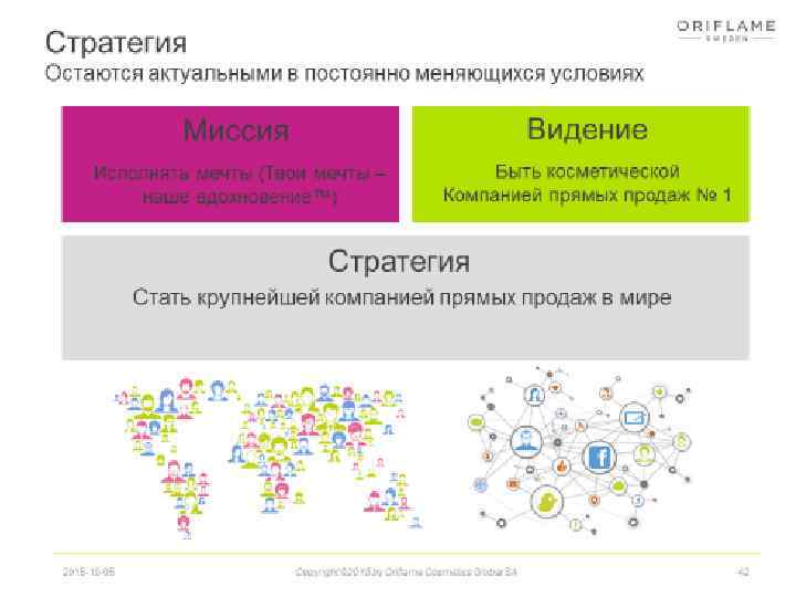 Представлена более чем на 60 рынках Косметическая компания прямых продаж Основана в Швеции в 1967 году Широкий ассортимент шведских инновационных продуктов для красоты, вдохновленных самой природой Ежегодные продажи ~€ 1. 3 Q 4 2014 Regional Split Консультантов ~3 млн Sales 2018 -02 -12 Active consultants Copyright © 2015 by Oriflame Cosmetics Global SA Adj. Operating profit 10
