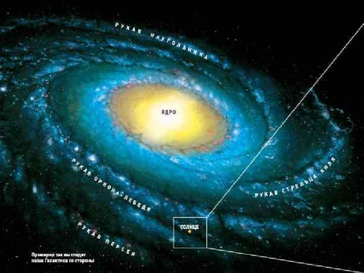 • Галактика Млечный путь имеет шарообразное ядро (центр, скопление звезд) и 4 вытянутых рукава. • В одном из рукавов, примерно на 2/3 от центра, находится Солнце. • Земля ориентирована в Галактике так, что ее Южное полушарие обращено к центру галактики, а Северное к краю галактики. • Звезды могут менять свои положения в Галактике, покидая рукава и возвращаясь в них через какое то время.