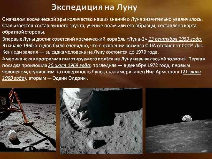 Первые сведения о луне ЛУНА – это, пожалуй, единственное небесное тело, в отношении которого с древнейших времен ни у кого не было сомнений, что оно движется вокруг Земли. Во II в. До н. э. Гиппарх определил наклон лунной орбиты к плоскости эклиптики и выявил ряд особенностей движения Луны. Он создал весьма совершенную для своего времени теорию ее движения, а также теорию солнечных и лунных затмений. ЛУНА, естественный спутник Земли, находится от нее на среднем расстоянии 384400 км. Наклон орбиты к плоскости эклиптики 5 ° 8' 43", масса 7, 349. 1022 кг (1/81, 3=0, 0123 массы Земли), средний радиус Луны 1737, 1 км (0, 2727 Земли), ускорение силы тяжести на поверхности 1, 62 м/с2. Средняя плотность 3341 кг/м 3, сидерический период обращения 27, 3 сут, синодический период обращения 29, 5 сут (708 часов). Светит отраженным солнечным светом, визуальное сферическое альбедо 0, 075 (отражает 7, 5% падающего солнечного света). После периодов бурной солнечной активности отдельные места лунной поверхности могут слабо светиться под действием люминесценции. Температура на поверхности Луны 100 -400 К (днем на экваторе достигает 130 о. С, а ночью минус 170 о. С. За 1, 5 часа затмения охлаждается до минус 100 о. С), магнитное поле 0, 4 гамм.