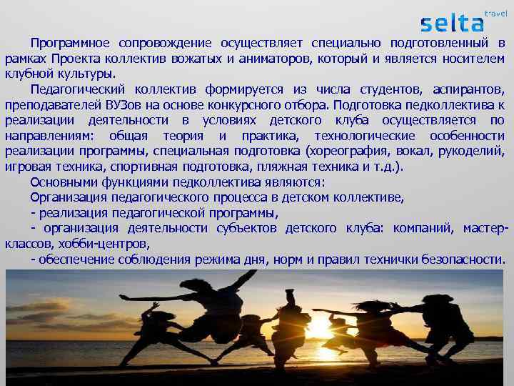 Программное сопровождение осуществляет специально подготовленный в рамках Проекта коллектив вожатых и аниматоров, который и является носителем клубной культуры. Педагогический коллектив формируется из числа студентов, аспирантов, преподавателей ВУЗов на основе конкурсного отбора. Подготовка педколлектива к реализации деятельности в условиях детского клуба осуществляется по направлениям: общая теория и практика, технологические особенности реализации программы, специальная подготовка (хореография, вокал, рукоделий, игровая техника, спортивная подготовка, пляжная техника и т. д. ). Основными функциями педколлектива являются: Организация педагогического процесса в детском коллективе, - реализация педагогической программы, - организация деятельности субъектов детского клуба: компаний, мастерклассов, хобби-центров, - обеспечение соблюдения режима дня, норм и правил технички безопасности.