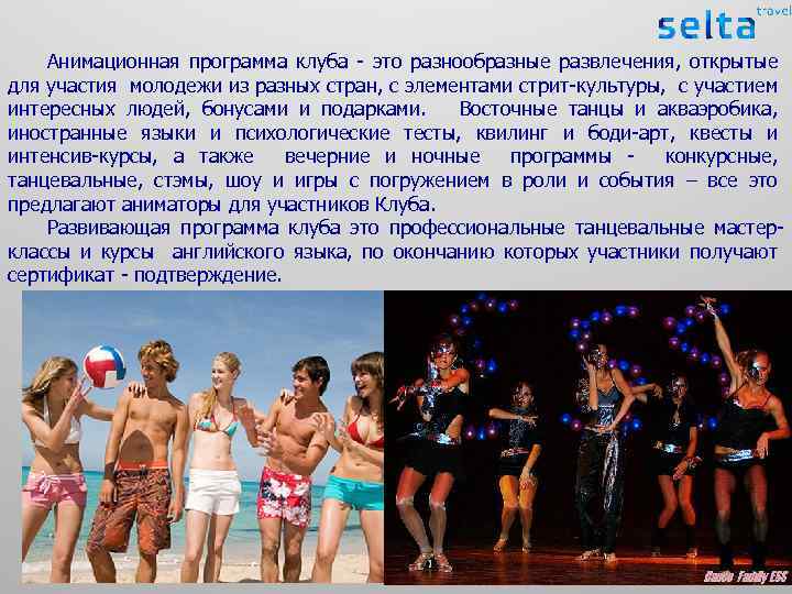 Анимационная программа клуба - это разнообразные развлечения, открытые для участия молодежи из разных стран, с элементами стрит-культуры, с участием интересных людей, бонусами и подарками. Восточные танцы и акваэробика, иностранные языки и психологические тесты, квилинг и боди-арт, квесты и интенсив-курсы, а также вечерние и ночные программы - конкурсные, танцевальные, стэмы, шоу и игры с погружением в роли и события – все это предлагают аниматоры для участников Клуба. Развивающая программа клуба это профессиональные танцевальные мастерклассы и курсы английского языка, по окончанию которых участники получают сертификат - подтверждение.