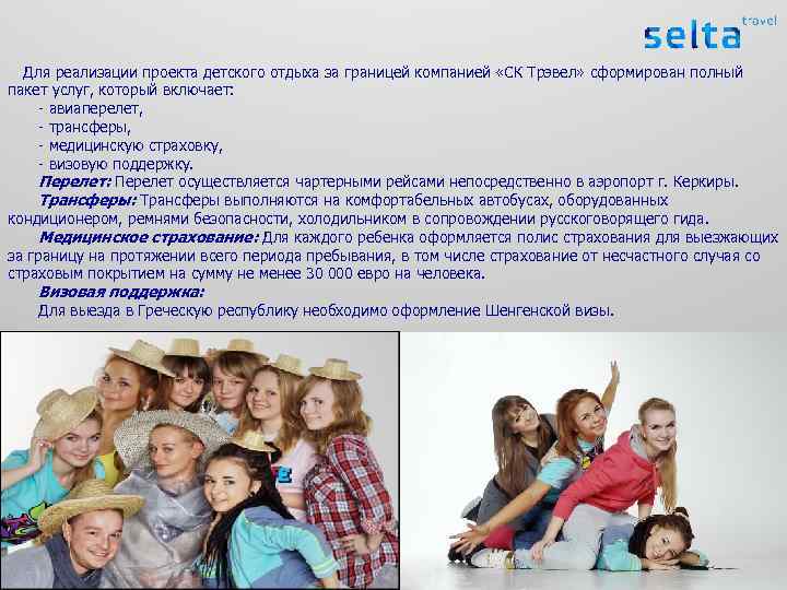 Для реализации проекта детского отдыха за границей компанией «СК Трэвел» сформирован полный пакет услуг, который включает: - авиаперелет, - трансферы, - медицинскую страховку, - визовую поддержку. Перелет: Перелет осуществляется чартерными рейсами непосредственно в аэропорт г. Керкиры. Трансферы: Трансферы выполняются на комфортабельных автобусах, оборудованных кондиционером, ремнями безопасности, холодильником в сопровождении русскоговорящего гида. Медицинское страхование: Для каждого ребенка оформляется полис страхования для выезжающих за границу на протяжении всего периода пребывания, в том числе страхование от несчастного случая со страховым покрытием на сумму не менее 30 000 евро на человека. Визовая поддержка: Для выезда в Греческую республику необходимо оформление Шенгенской визы.