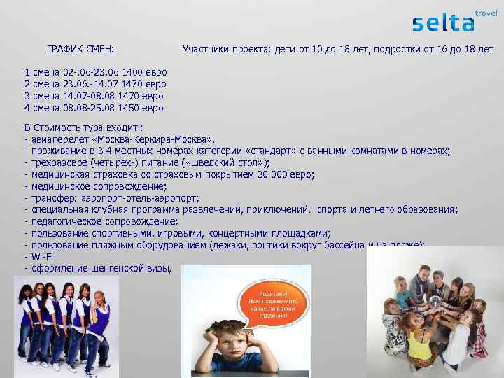 ГРАФИК СМЕН: Участники проекта: дети от 10 до 18 лет, подростки от 16 до 18 лет 1 смена 02 -. 06 -23. 06 1400 евро 2 смена 23. 06. -14. 07 1470 евро 3 смена 14. 07 -08. 08 1470 евро 4 смена 08. 08 -25. 08 1450 евро В Стоимость тура входит : - авиаперелет «Москва-Керкира-Москва» , - проживание в 3 -4 местных номерах категории «стандарт» с ванными комнатами в номерах; - трехразовое (четырех-) питание ( «шведский стол» ); - медицинская страховка со страховым покрытием 30 000 евро; - медицинское сопровождение; - трансфер: аэропорт-отель-аэропорт; - специальная клубная программа развлечений, приключений, спорта и летнего образования; - педагогическое сопровождение; - пользование спортивными, игровыми, концертными площадками; - пользование пляжным оборудованием (лежаки, зонтики вокруг бассейна и на пляже); - Wi-Fi - оформление шенгенской визы,