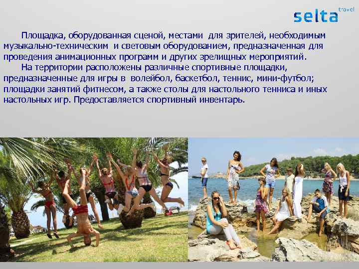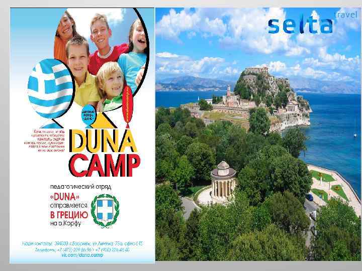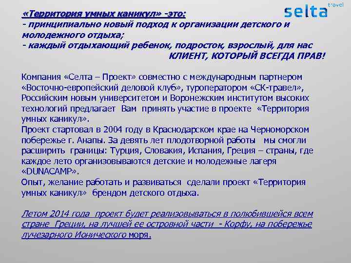 «Территория умных каникул» -это: - принципиально новый подход к организации детского и молодежного отдыха; - каждый отдыхающий ребенок, подросток, взрослый, для нас КЛИЕНТ, КОТОРЫЙ ВСЕГДА ПРАВ! Компания «Селта – Проект» совместно с международным партнером «Восточно-европейский деловой клуб» , туроператором «СК-травел» , Российским новым университетом и Воронежским институтом высоких технологий предлагает Вам принять участие в проекте «Территория умных каникул» . Проект стартовал в 2004 году в Краснодарском крае на Черноморском побережье г. Анапы. За девять лет плодотворной работы мы смогли расширить границы: Турция, Словакия, Испания, Греция – страны, где каждое лето организовываются детские и молодежные лагеря «DUNACAMP» . Опыт, желание работать и развиваться сделали проект «Территория умных каникул» брендом детского отдыха. Летом 2014 года проект будет реализовываться в полюбившейся всем стране Греции, на лучшей ее островной части - Корфу, на побережье лучезарного Ионического моря.