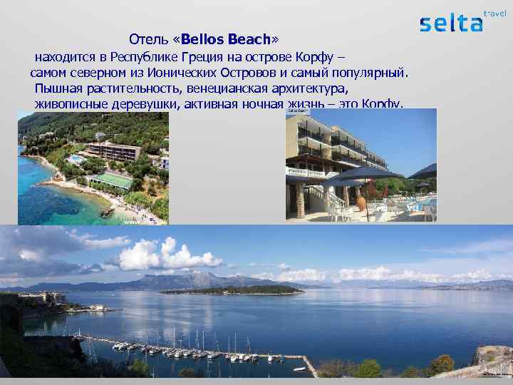 Отель «Bellos Beach» находится в Республике Греция на острове Корфу – самом северном из Ионических Островов и самый популярный. Пышная растительность, венецианская архитектура, живописные деревушки, активная ночная жизнь – это Корфу.