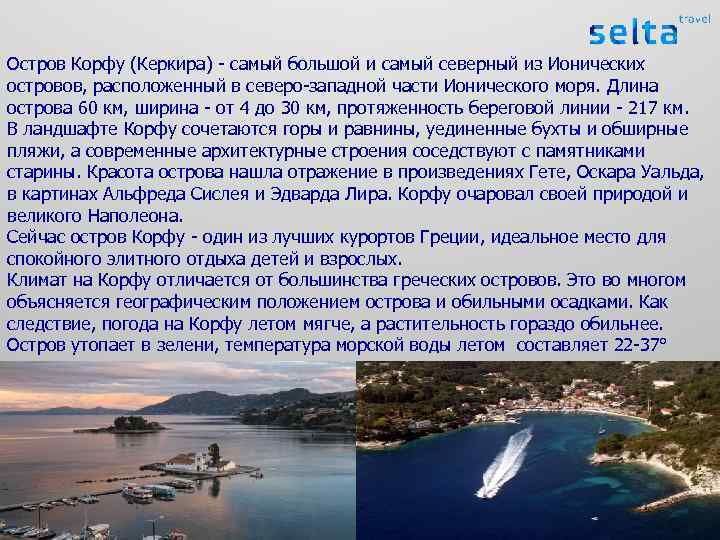 Остров Корфу (Керкира) - самый большой и самый северный из Ионических островов, расположенный в северо-западной части Ионического моря. Длина острова 60 км, ширина - от 4 до 30 км, протяженность береговой линии - 217 км. В ландшафте Корфу сочетаются горы и равнины, уединенные бухты и обширные пляжи, а современные архитектурные строения соседствуют с памятниками старины. Красота острова нашла отражение в произведениях Гете, Оскара Уальда, в картинах Альфреда Сислея и Эдварда Лира. Корфу очаровал своей природой и великого Наполеона. Сейчас остров Корфу - один из лучших курортов Греции, идеальное место для спокойного элитного отдыха детей и взрослых. Климат на Корфу отличается от большинства греческих островов. Это во многом объясняется географическим положением острова и обильными осадками. Как следствие, погода на Корфу летом мягче, а растительность гораздо обильнее. Остров утопает в зелени, температура морской воды летом составляет 22 -37°