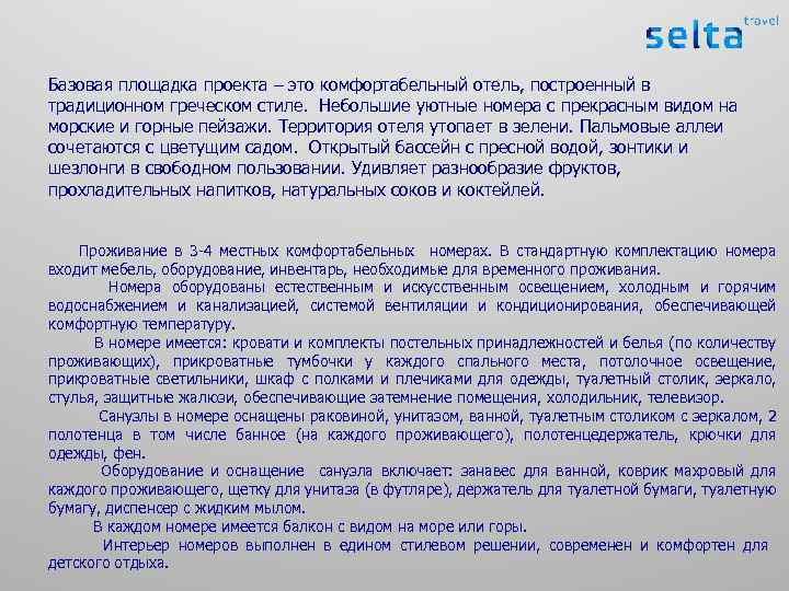 Базовая площадка проекта – это комфортабельный отель, построенный в традиционном греческом стиле. Небольшие уютные номера с прекрасным видом на морские и горные пейзажи. Территория отеля утопает в зелени. Пальмовые аллеи сочетаются с цветущим садом. Открытый бассейн с пресной водой, зонтики и шезлонги в свободном пользовании. Удивляет разнообразие фруктов, прохладительных напитков, натуральных соков и коктейлей. Проживание в 3 -4 местных комфортабельных номерах. В стандартную комплектацию номера входит мебель, оборудование, инвентарь, необходимые для временного проживания. Номера оборудованы естественным и искусственным освещением, холодным и горячим водоснабжением и канализацией, системой вентиляции и кондиционирования, обеспечивающей комфортную температуру. В номере имеется: кровати и комплекты постельных принадлежностей и белья (по количеству проживающих), прикроватные тумбочки у каждого спального места, потолочное освещение, прикроватные светильники, шкаф с полками и плечиками для одежды, туалетный столик, зеркало, стулья, защитные жалюзи, обеспечивающие затемнение помещения, холодильник, телевизор. Санузлы в номере оснащены раковиной, унитазом, ванной, туалетным столиком с зеркалом, 2 полотенца в том числе банное (на каждого проживающего), полотенцедержатель, крючки для одежды, фен. Оборудование и оснащение санузла включает: занавес для ванной, коврик махровый для каждого проживающего, щетку для унитаза (в футляре), держатель для туалетной бумаги, туалетную бумагу, диспенсер с жидким мылом. В каждом номере имеется балкон с видом на море или горы. Интерьер номеров выполнен в едином стилевом решении, современен и комфортен для детского отдыха.