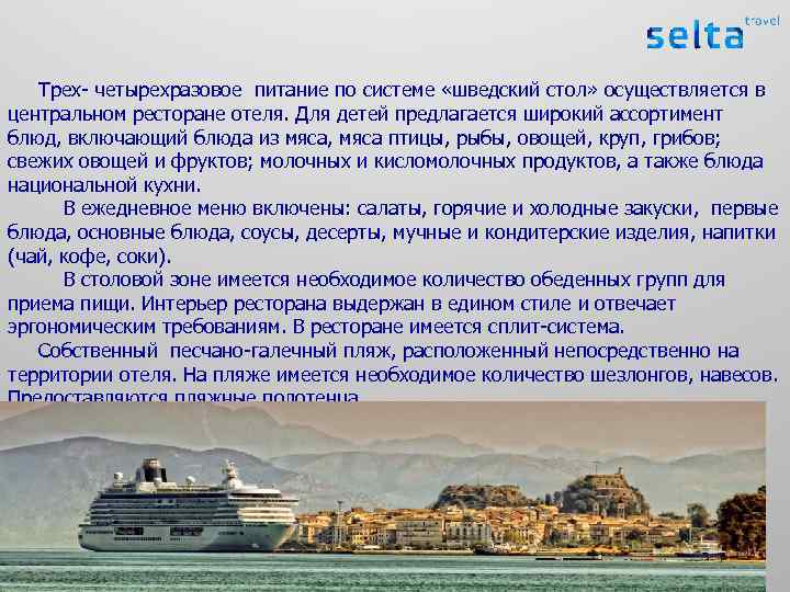 Трех- четырехразовое питание по системе «шведский стол» осуществляется в центральном ресторане отеля. Для детей предлагается широкий ассортимент блюд, включающий блюда из мяса, мяса птицы, рыбы, овощей, круп, грибов; свежих овощей и фруктов; молочных и кисломолочных продуктов, а также блюда национальной кухни. В ежедневное меню включены: салаты, горячие и холодные закуски, первые блюда, основные блюда, соусы, десерты, мучные и кондитерские изделия, напитки (чай, кофе, соки). В столовой зоне имеется необходимое количество обеденных групп для приема пищи. Интерьер ресторана выдержан в едином стиле и отвечает эргономическим требованиям. В ресторане имеется сплит-система. Собственный песчано-галечный пляж, расположенный непосредственно на территории отеля. На пляже имеется необходимое количество шезлонгов, навесов. Предоставляются пляжные полотенца.