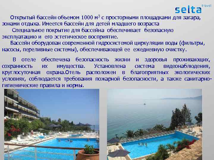 Открытый бассейн объемом 1000 м 3 с просторными площадками для загара, зонами отдыха. Имеется бассейн для детей младшего возраста Специальное покрытие для бассейна обеспечивает безопасную эксплуатацию и его эстетическое восприятие. Бассейн оборудован современной гидросистемой циркуляции воды (фильтры, насосы, переливные системы), обеспечивающей ее ежедневную очистку. В отеле обеспечена безопасность жизни и здоровья проживающих, сохранность их имущества. Установлена система видеонаблюдения, круглосуточная охрана. Отель расположен в благоприятных экологических условиях, соблюдается требования пожарной безопасности, а также санитарногигиенические правила и нормы.