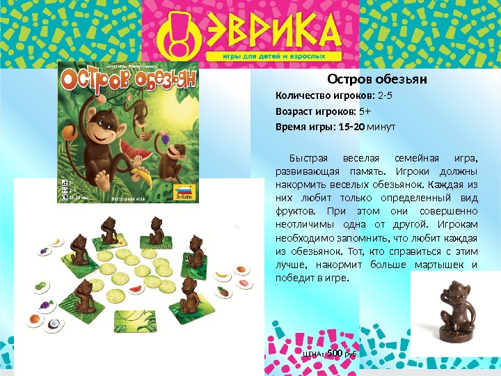 ЦЕНА : 500 руб. Остров обезьян Количество игроков: 2 -5 Возраст игроков: 5+ Время игры: 15 -20 минут Быстрая веселая семейная игра, развивающая память. Игроки должны накормить веселых обезьянок. Каждая из них любит только определенный вид фруктов. При этом они совершенно неотличимы одна от другой. Игрокам необходимо запомнить, что любит каждая из обезьянок. Тот, кто справиться с этим лучше, накормит больше мартышек и победит в игре.