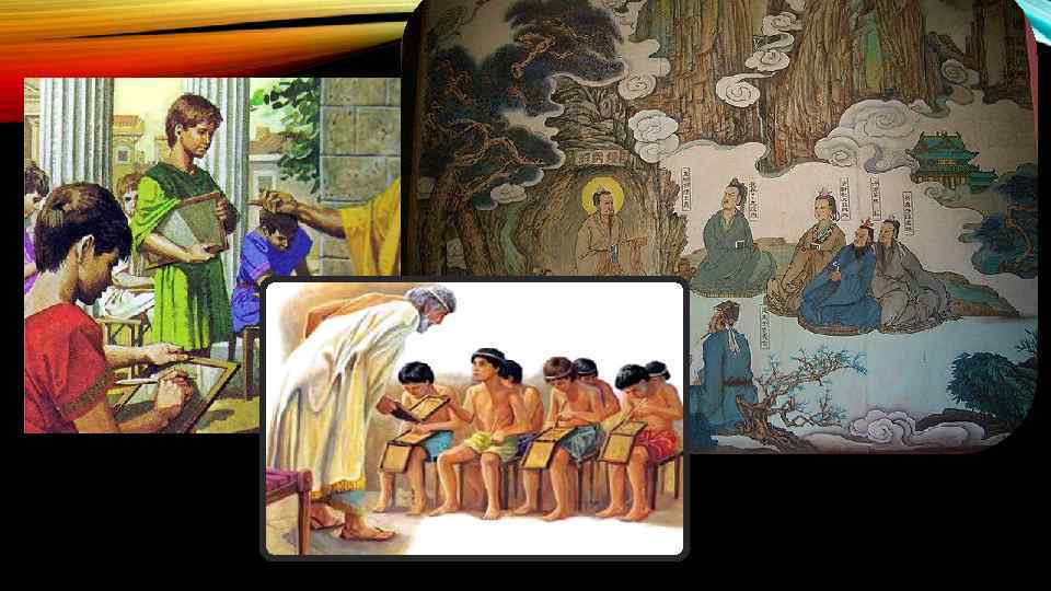 ЧТО ОЗНАЧАЛО СЛОВО «ШКОЛА» В ДРЕВНИЕ ВРЕМЕНА • Что такое школа? Прежде всего, это место, где человек получает знания. Известно, что пять-шесть тысяч лет назад в Китае уже существовали школы. Сам термин «школа» переводится с греческого как «досуг, проведение свободного времени» . Есть теория, согласно которой первые школы организовывались как место, где могли общаться люди, неспособные к активной трудовой деятельности. А именно, старики и дети. В процессе общения пожилые люди передавали детям свои знания, со временем такой способ передачи знаний стал основным. И как бы ни менялись названия образовательных учреждений, будь то техникумы, институты или университеты, по своей сути они оставались и остаются все теми же школами – местом, где люди получают знания.