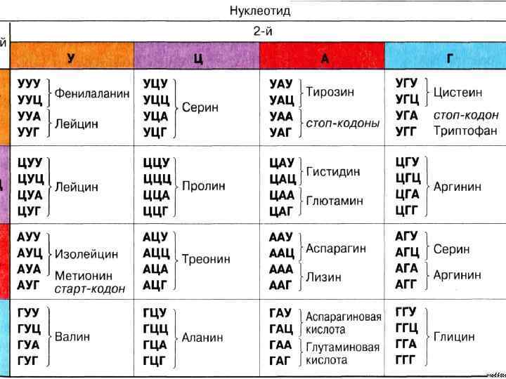 4)Универсальность – все живые организмы на Земле имеют одинаковый генетический код, одинаковые аминокислоты кодируются одинаковыми триплетами 5) Код прерывен – между генами находятся бессмысленные кодоны, которые являются знаками препинания 6)Неперекрываемость – конец или начало одного гена не является концом или началом другого гена