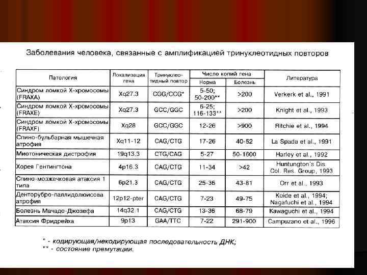 Общие характеристики этого класса болезней следующие: Генетическая антиципация описана для ревматоидного артрита, неспецифического язвенного колита, нейродегенеративных заболеваний. l Есть прямая корреляция между числом повторов и тяжестью клинической картины. l