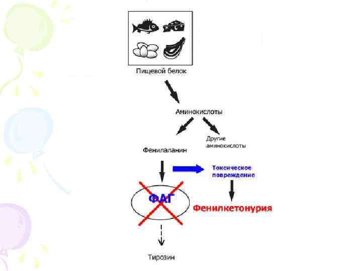 Фенилкетонурия В норме избыток фенилаланина, поступившего с пищей и не использованного для синтеза белка, превращается в тирозин. У больных фенилкетонурии эта аминокислота накапливается в крови. Повышение уровня содержания фенилаланина само по себе не опасно, но оно стимулирует необычные реакции, в результате которых в организме накапливается производные фенилаланина.