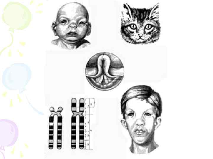 Хромосомные болезни Синдром «кошачьего крика» 44 + XX, 44 + XY Заболевание вызвано утратой (делецией) длинного плеча 5 -й хромосомы. Эта мутация приводит к патологическому развитию гортани, что вызывает характерный плач ребенка, который напоминает мяуканье из-за недоразвития гортани.