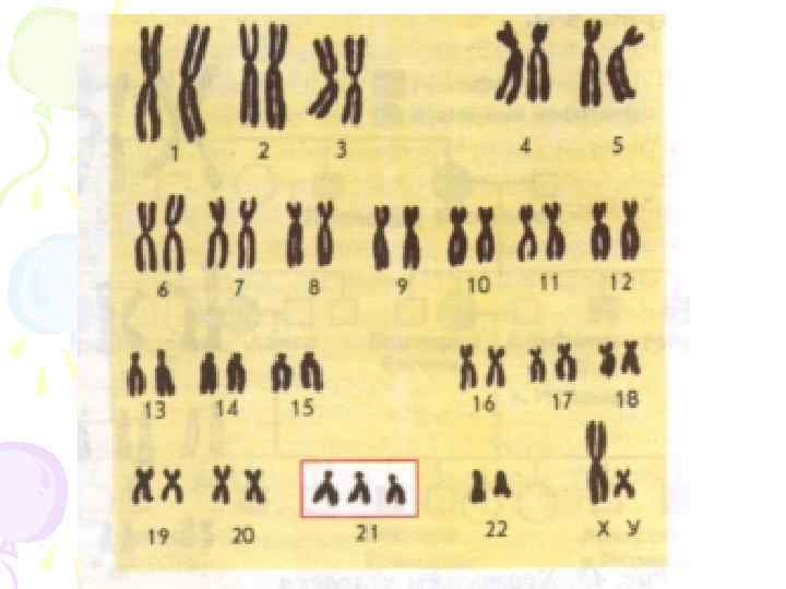 Хромосомные болезни Широко известная болезнь Дауна (синдром Дауна) является результатом присутствия в кариотипе лишней хромосомы из 21 -й пары (трисомия по 21 -й хромосоме). Причиной служит нерасхождение половых хромосом при образовании половых клеток у матери. Частота проявления 1: 500