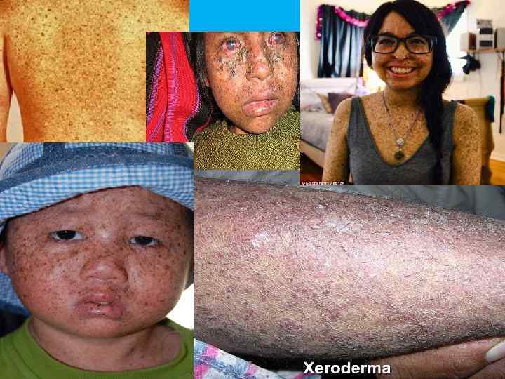 КСЕРОДЕРМА ПИГМЕНТНАЯ (дерматоз Капоши) Пигментная ксеродерма – заболевание, протекающее с поражением кожи, фоточувствительностью, злокачественными новообразованиями. Ø Клинические признаки: фотофобия, повышенная чувствительность к УФЛ, развитие рака и атрофии кожи, гиперпигментация типа веснушек, кератоз, ангиомы, рубцы роговицы и опухоли конъюнктивы и век, дефекты зубов. У новорожденных только фотофобия. Кожные изменения появляются к 3 -4 годам. Продолжительность жизни – 20 лет Ø Тип наследования: АР Ø Популяционная частота - неизвестна Ø