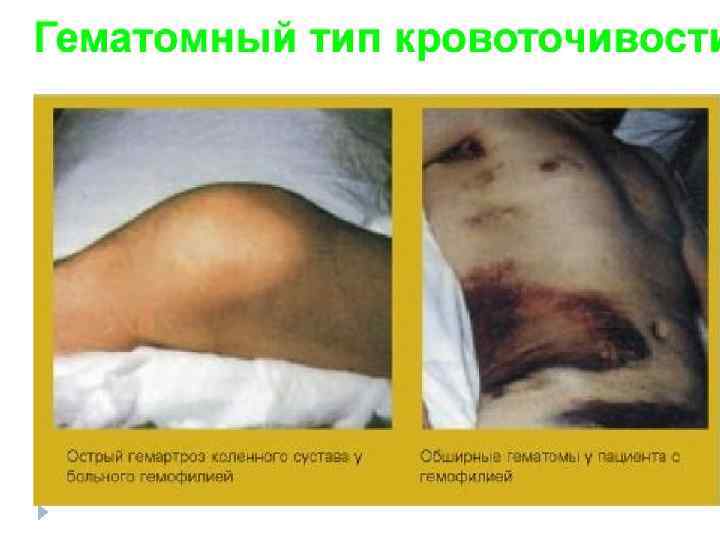 ГЕМОФИЛИЯ u u u Клинические признаки: под- и внутри кожные кровотечения, кровоизлияния в крупные суставы, подкожные и межмышечные гематомы, гематурия, сильное кровотечение при травмах. Причина: дефи- цит антигемофильного глобулина. Тип наследования: Хрецессивный Популяционная частота – 1 : 2500 (мальчиков)