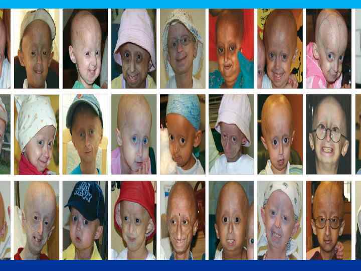 ПРОГЕРИЯ Описана в 1886 г. Клинические признаки: редкое генетическое заболевание, уско-ряющее процесс старения в 8 -10 раз. Дети умирают в 13 -15 лет после нескольких инфарктов и инсультов дряхлыми стариками. Болезнь вызывает мутантный ген LMNA, отвечающий за синтез белков Lamin A, B, C, необходимых для соединительной ткани. Наступает тотальная алопеция, на коже черепа выражена венозная сеть. Тип наследования и популяционная частота-?